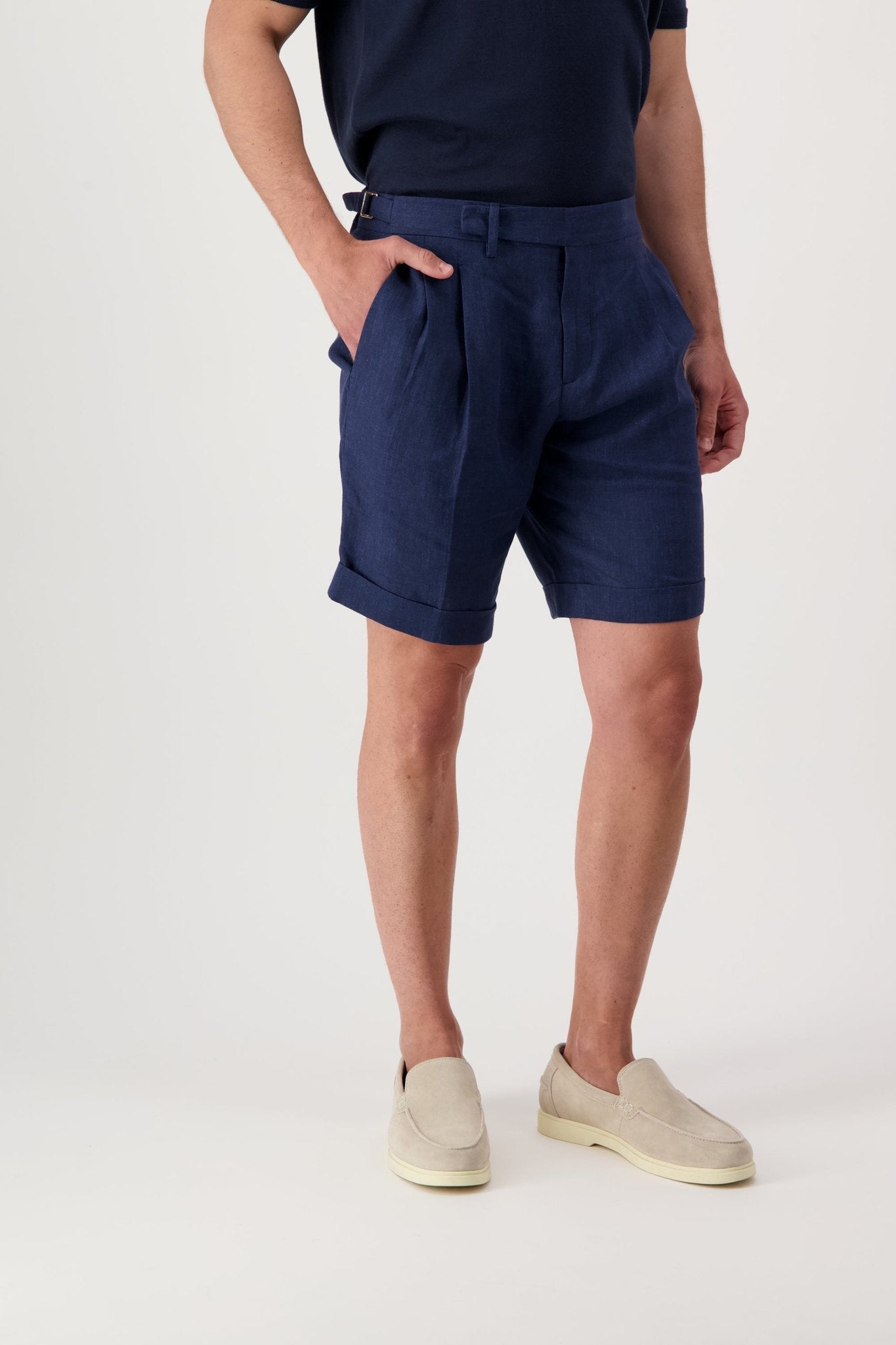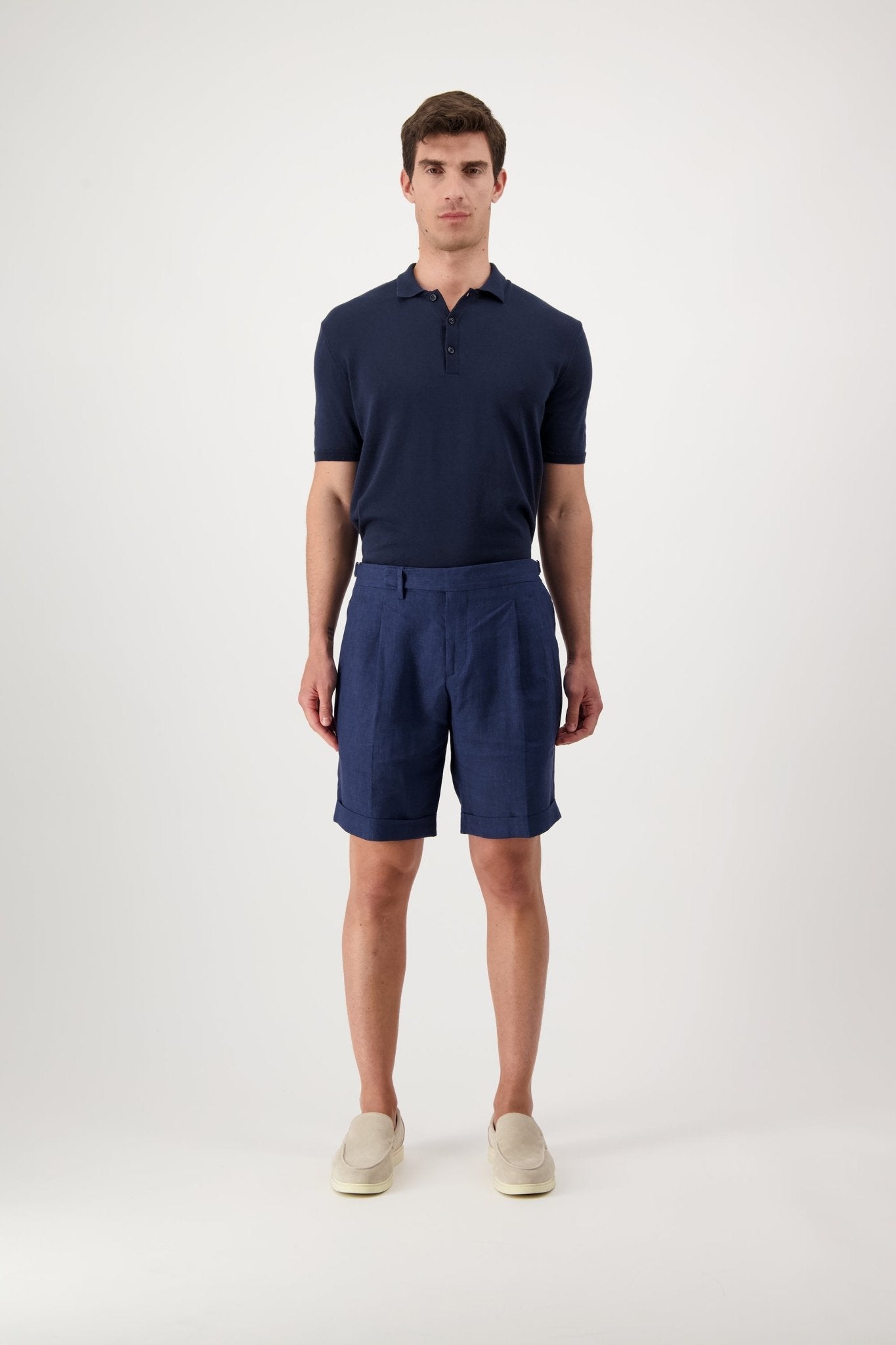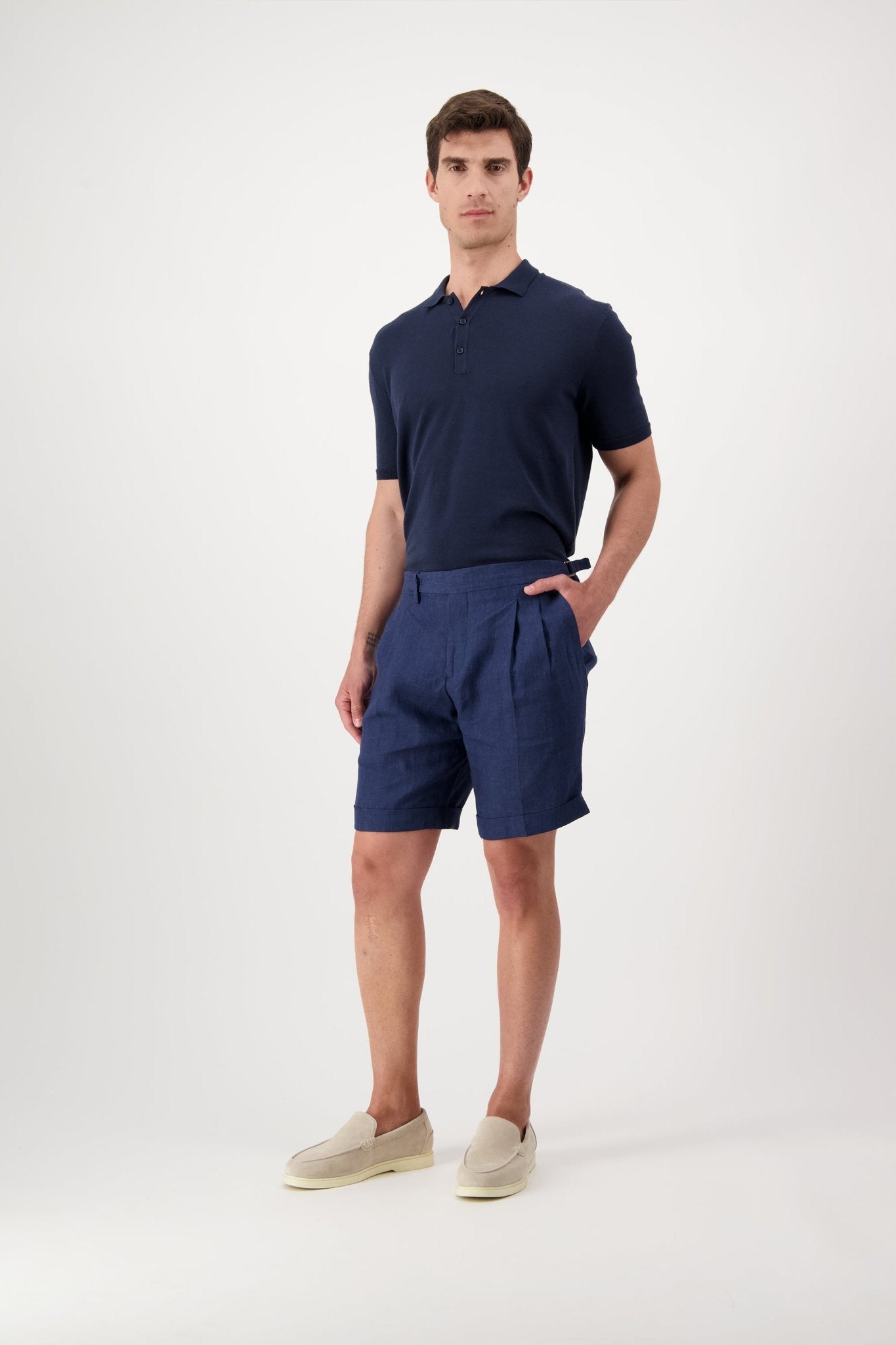 Linen shorts with slant pockets and zip closure. The model is 188 cm tall and wears a size 50.