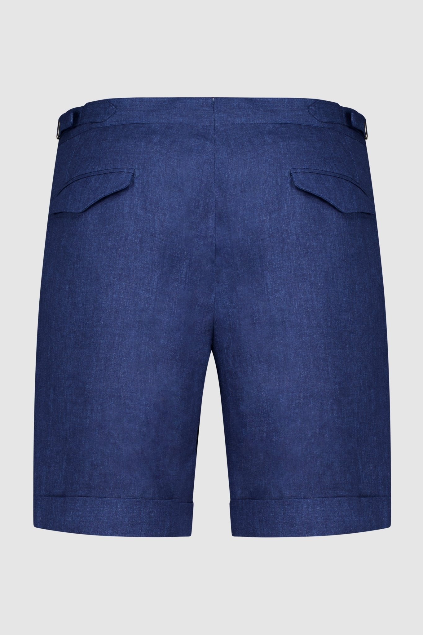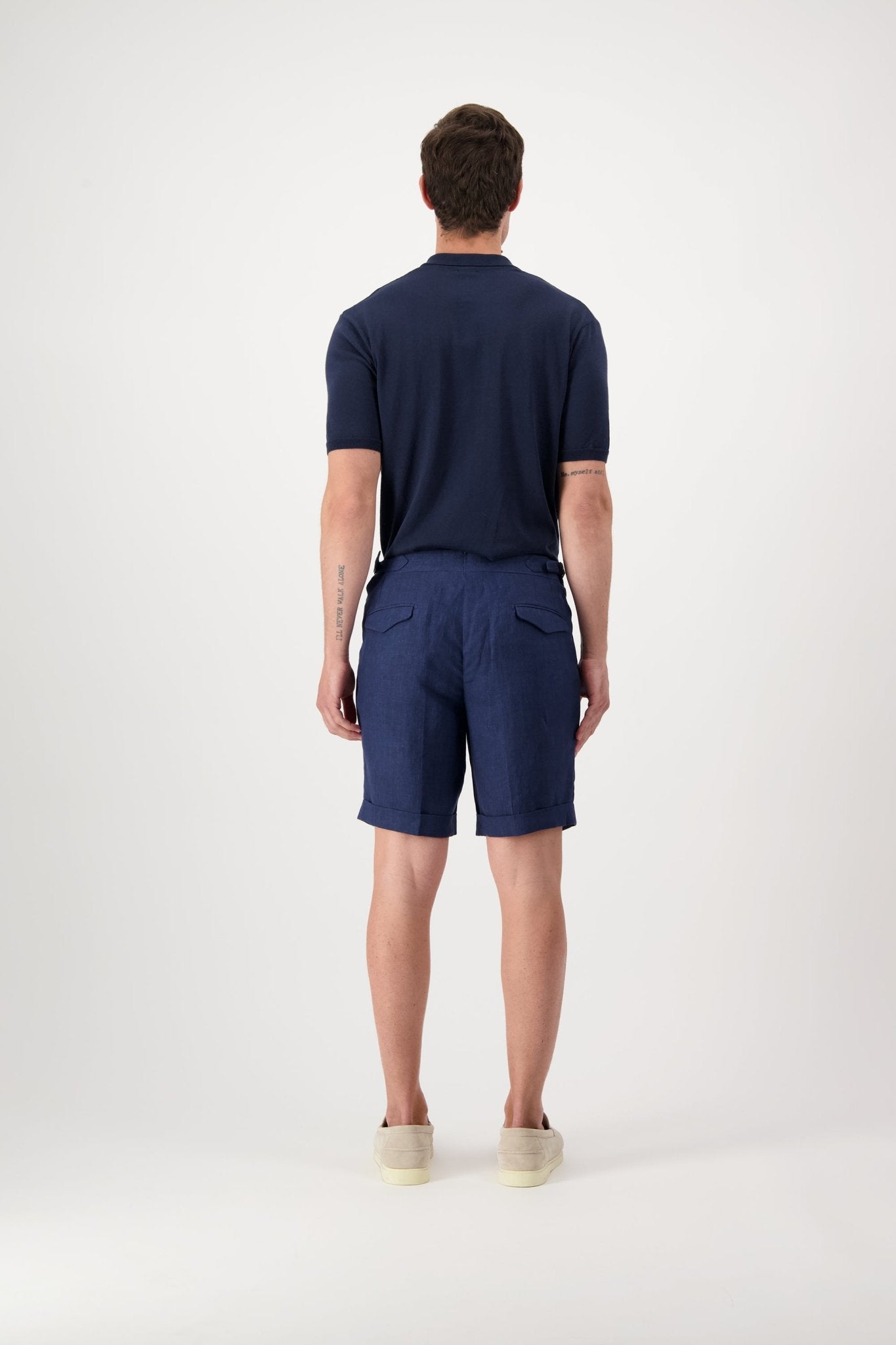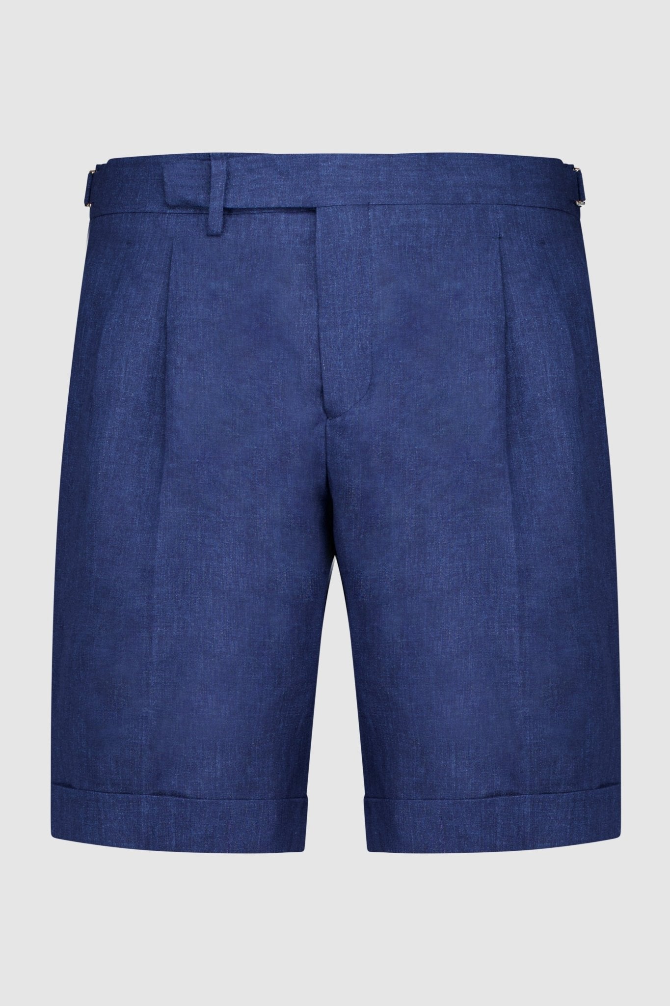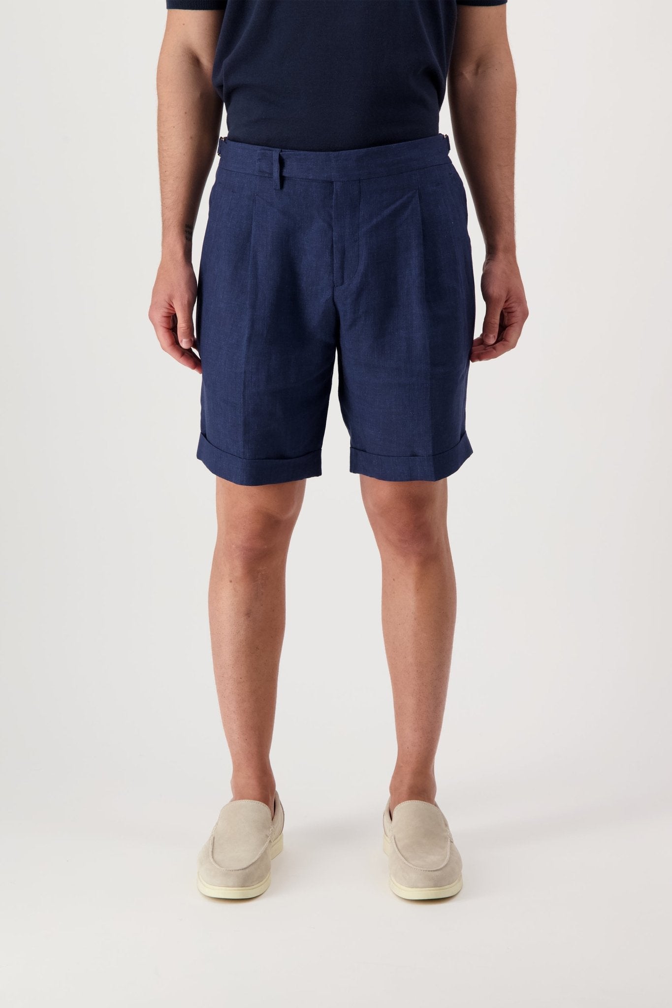 Linen shorts with slant pockets and zip closure. The model is 188 cm tall and wears a size 50.
