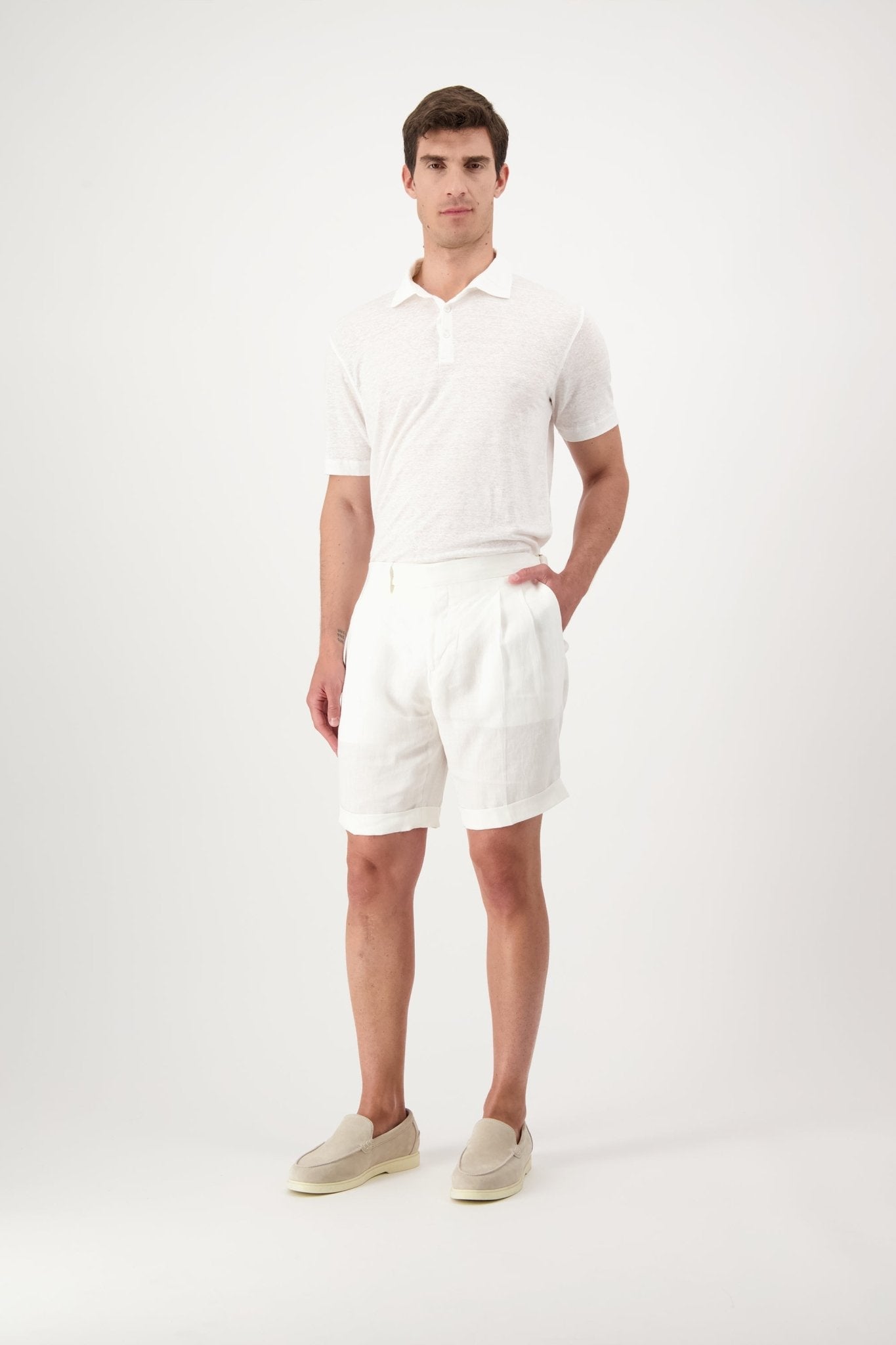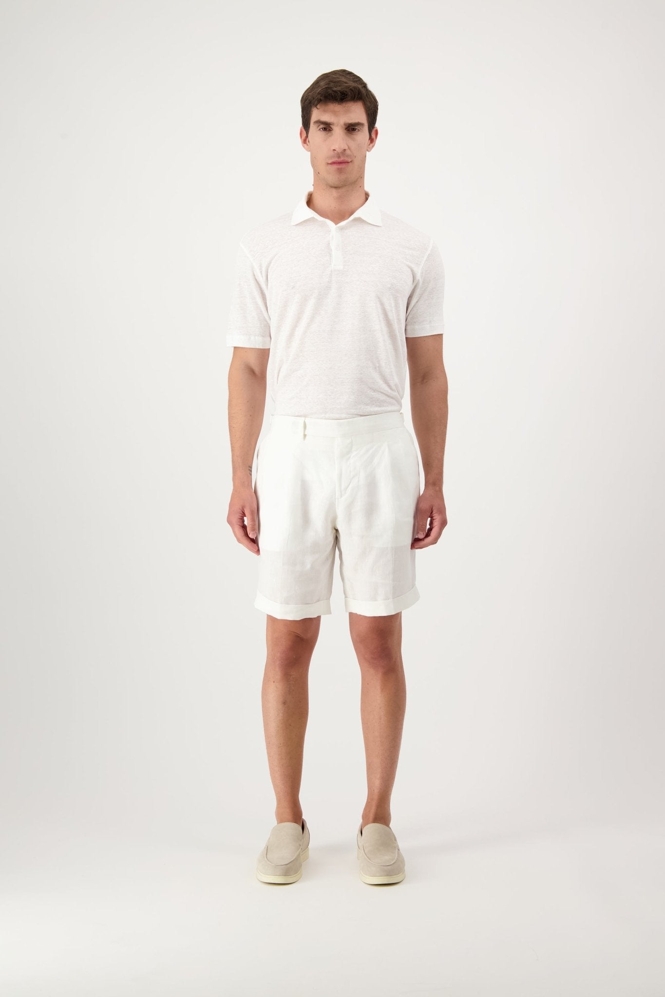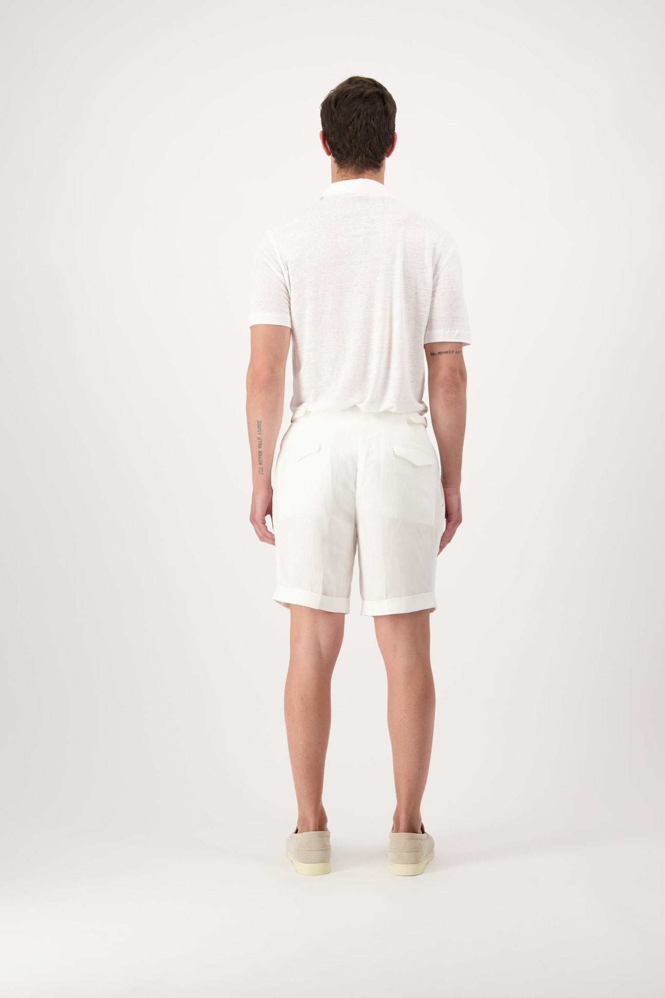 Linen shorts with slant pockets and zip closure. The model is 188 cm tall and wears a size 50.