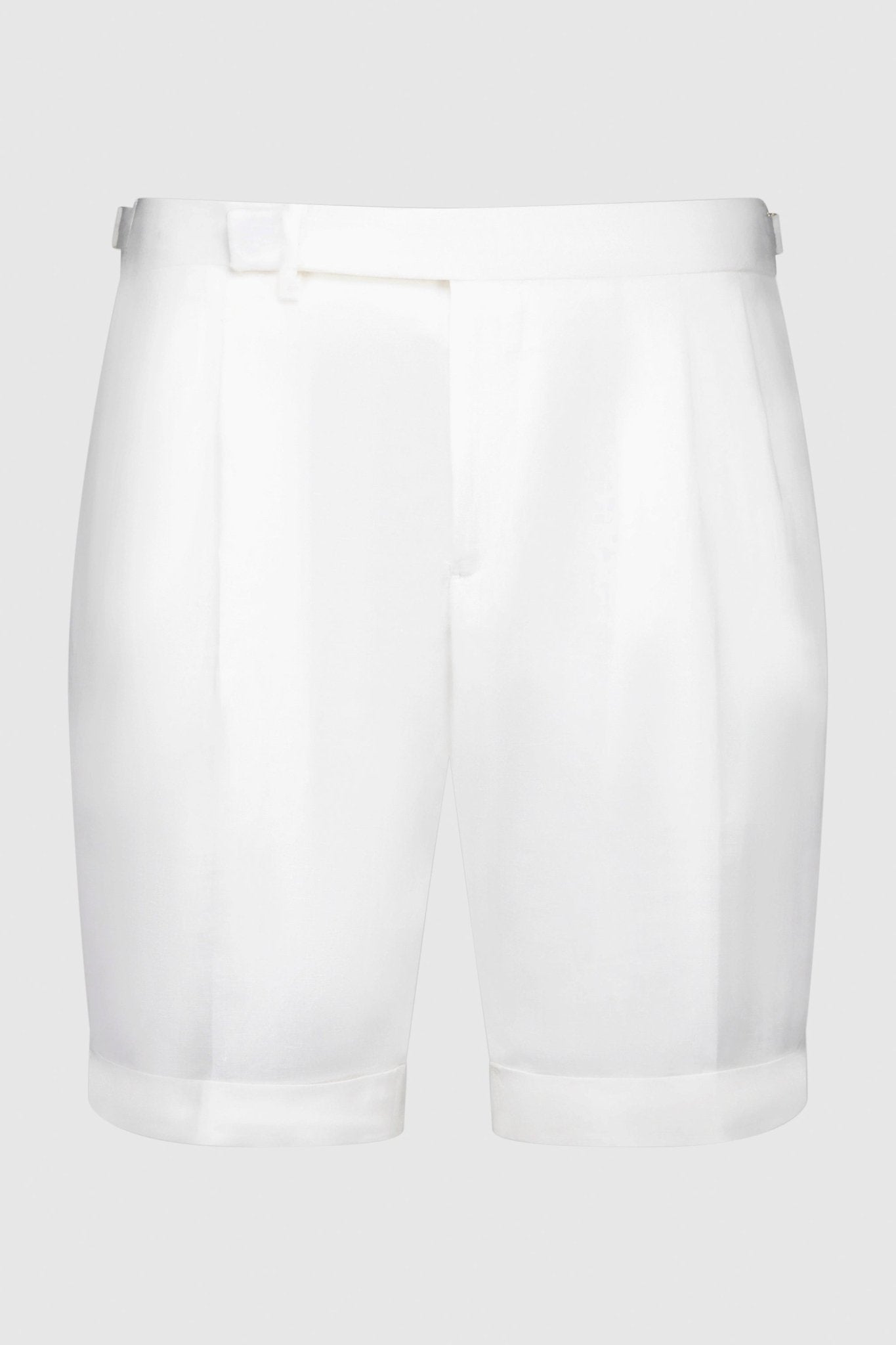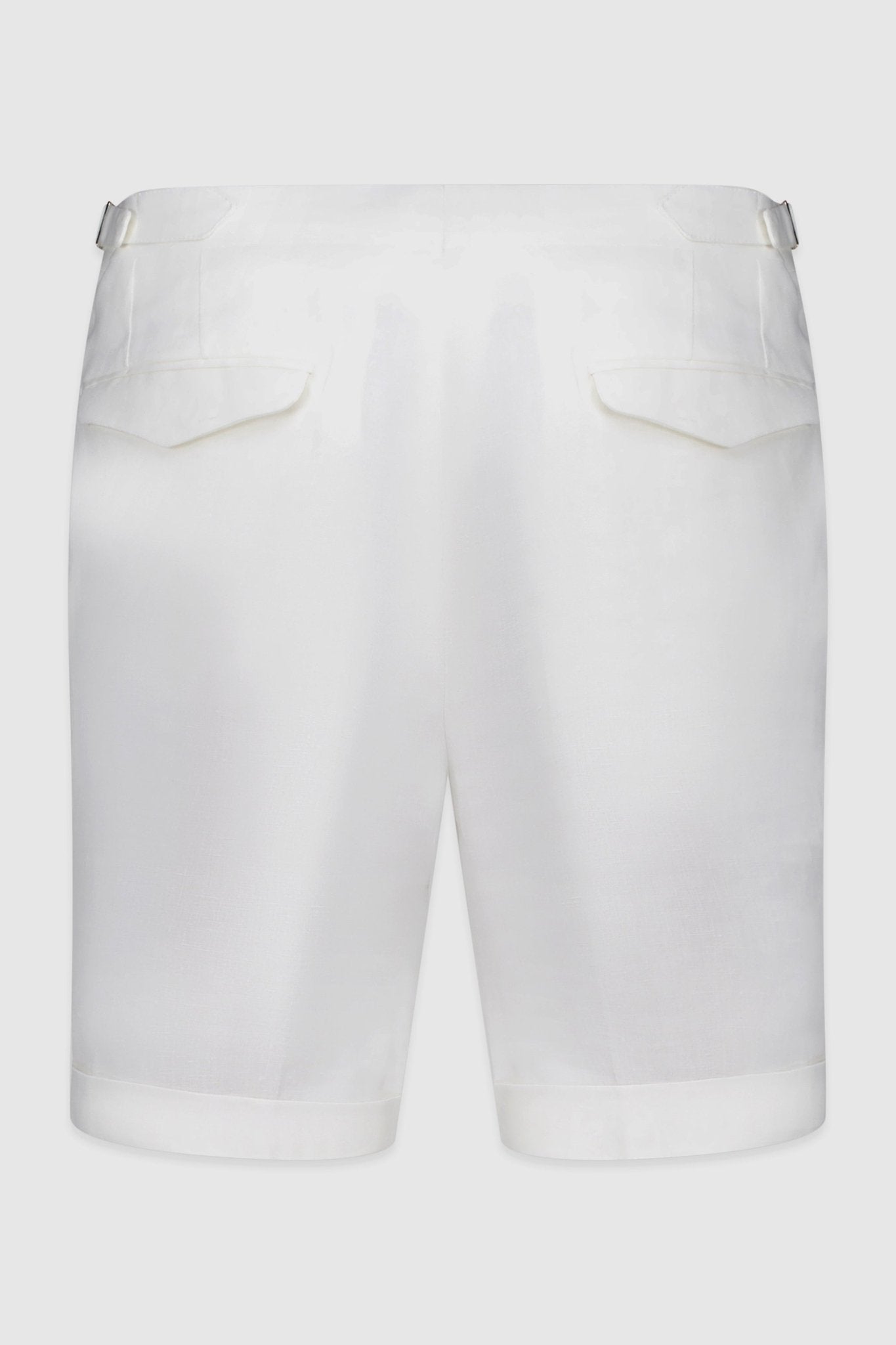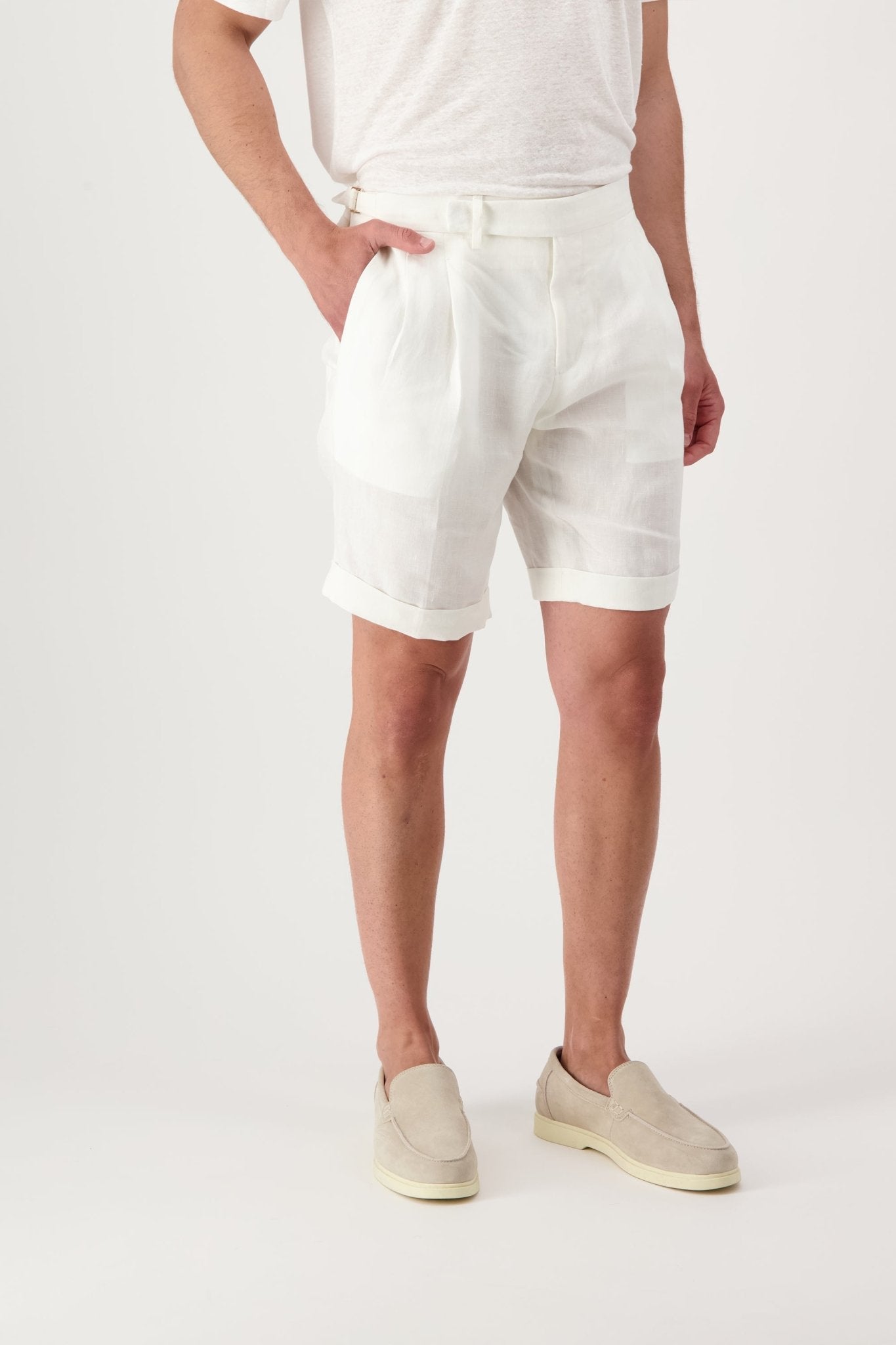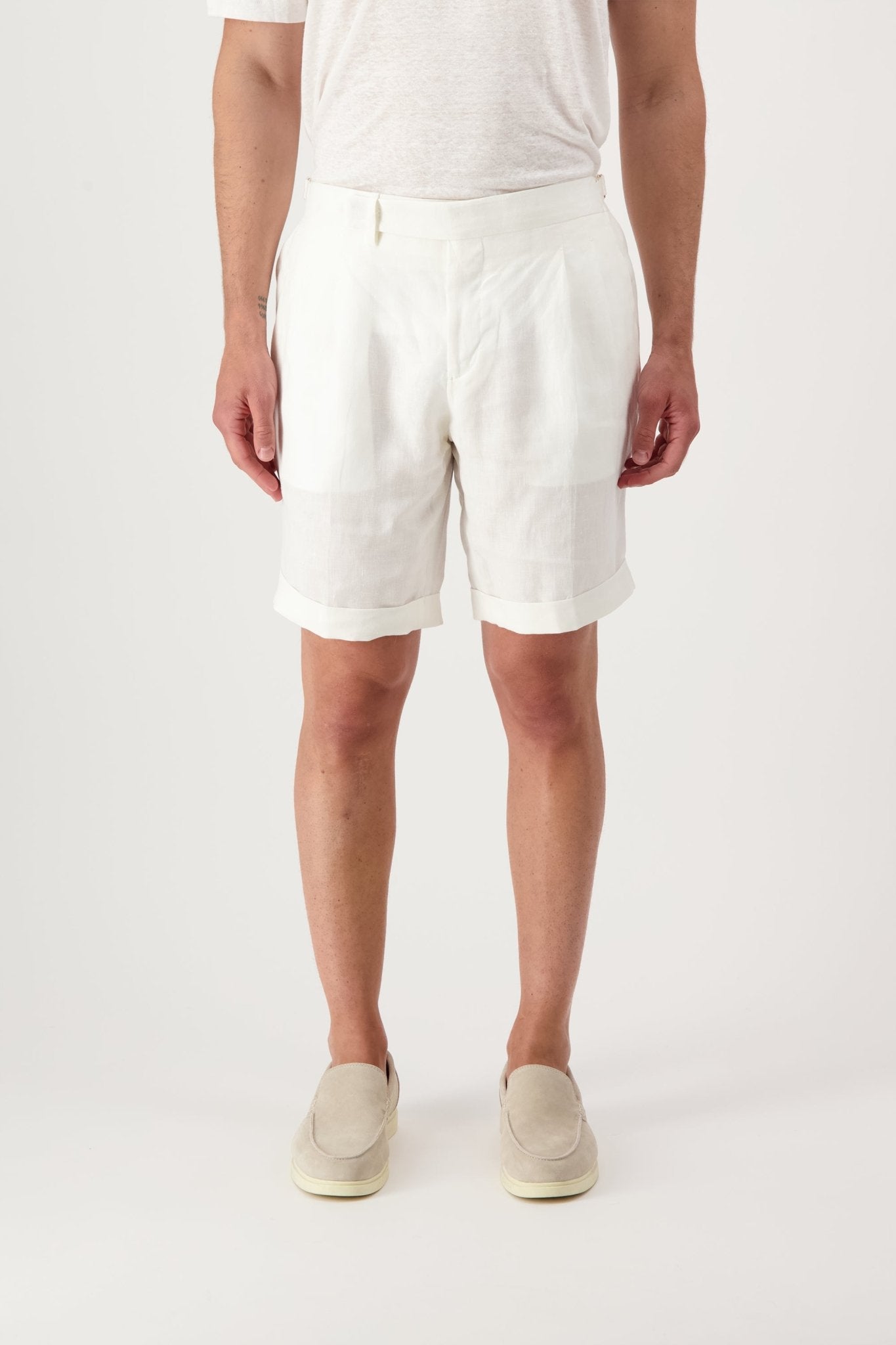 Linen shorts with slant pockets and zip closure. The model is 188 cm tall and wears a size 50.
