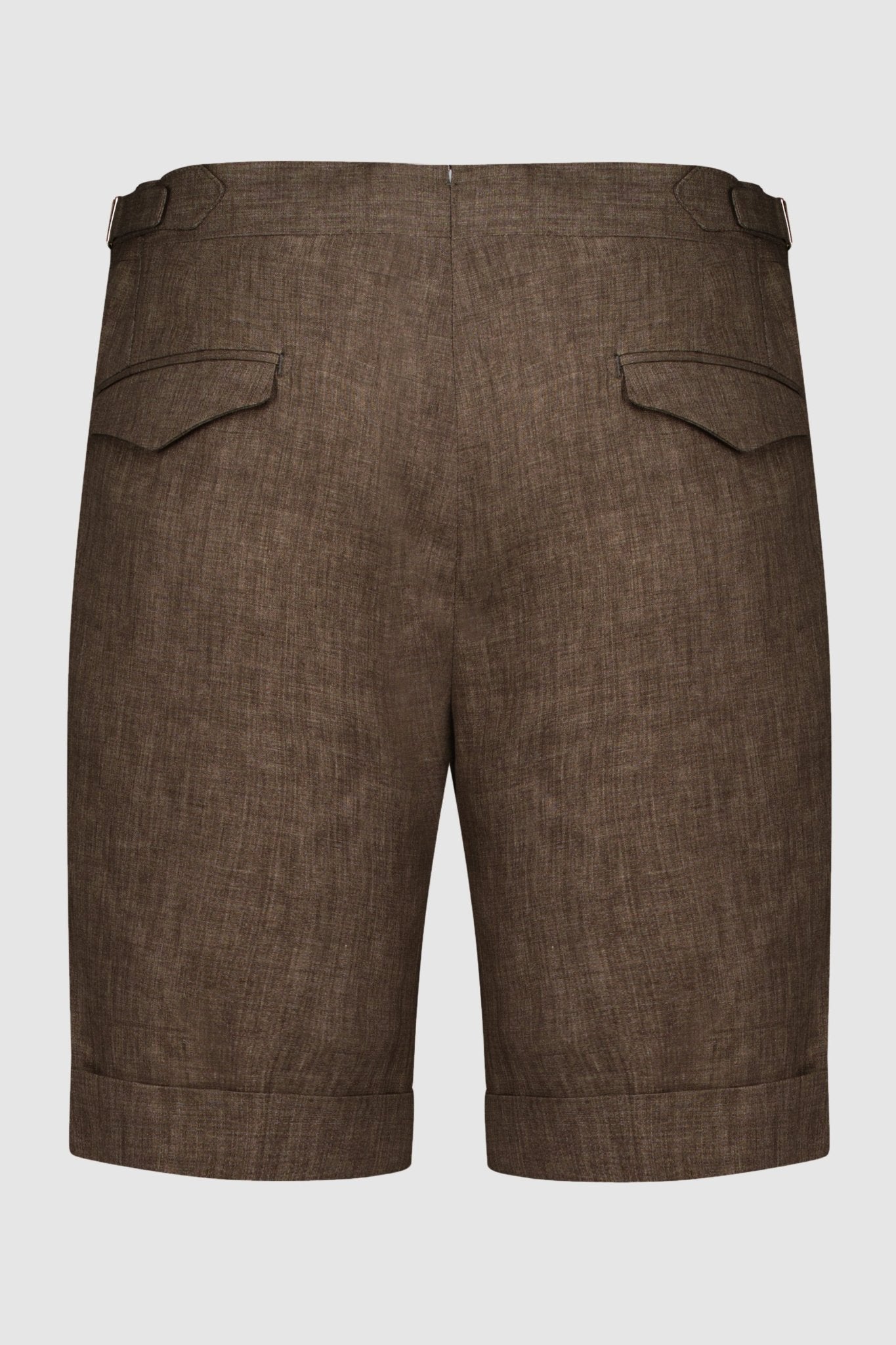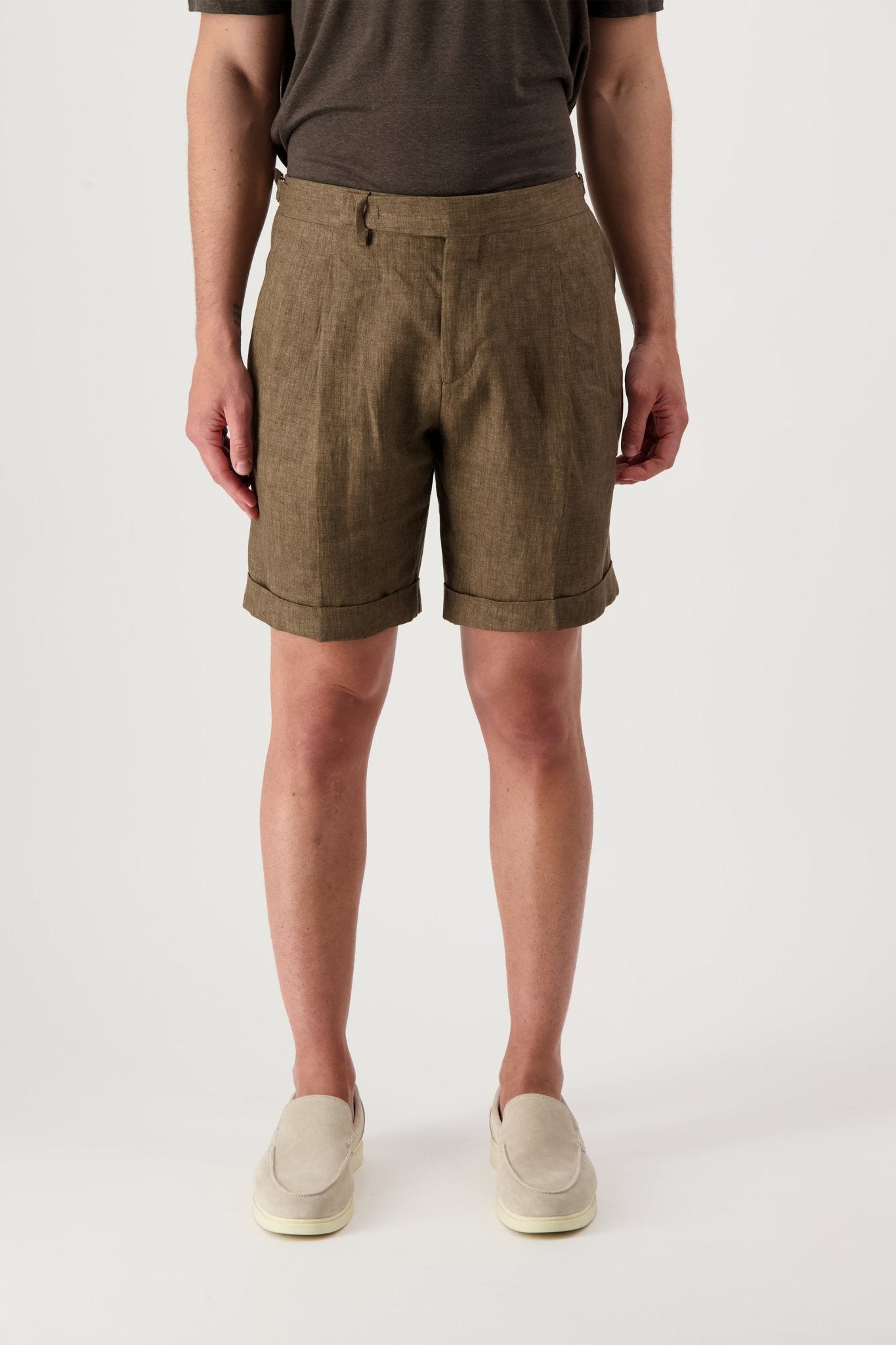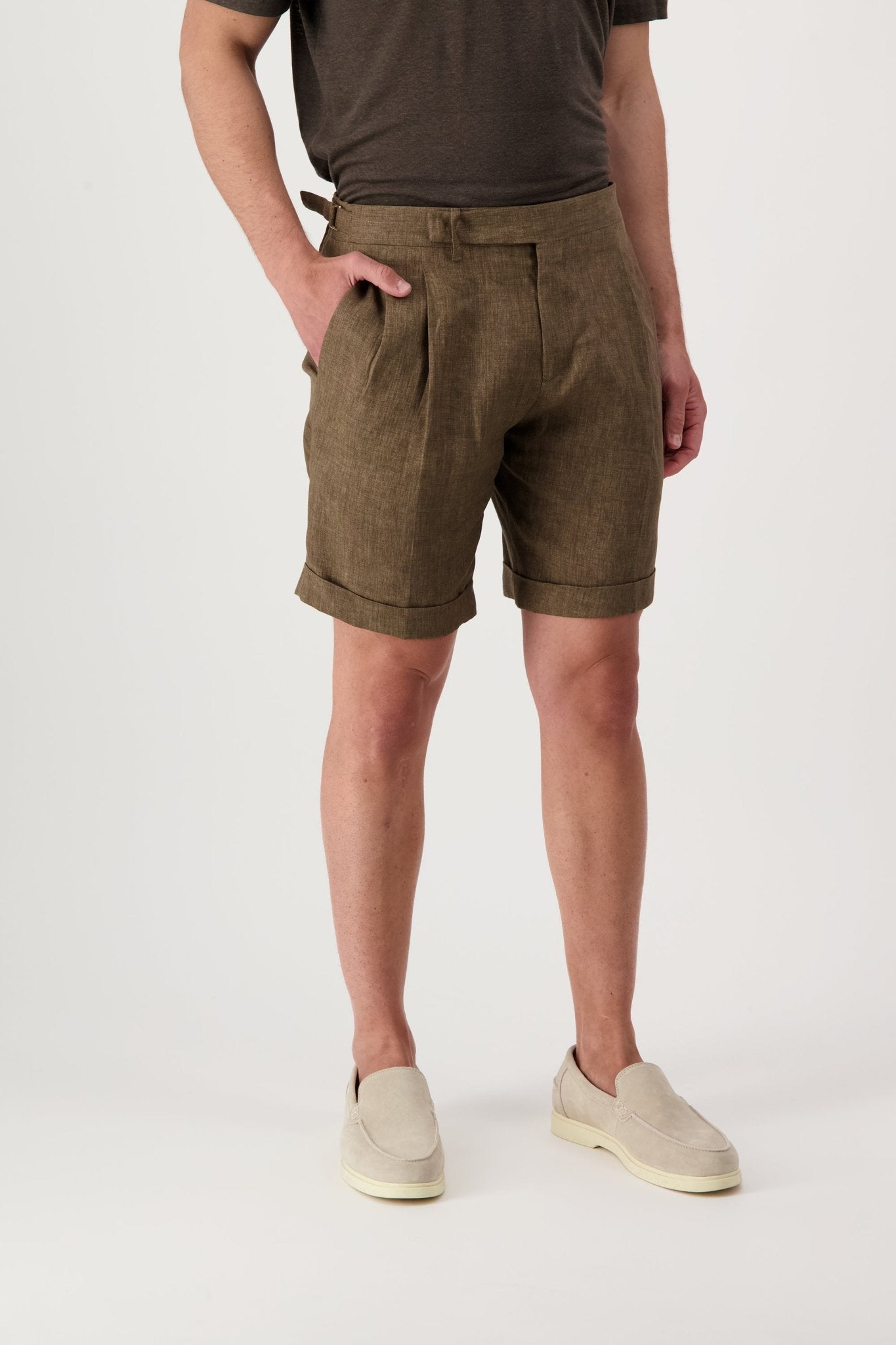 Linen shorts with slant pockets and zip closure. The model is 188 cm tall and wears a size 50.