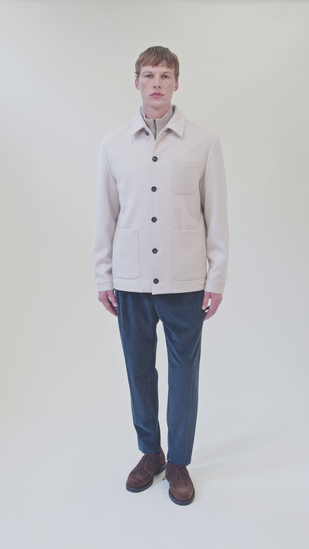 Elegant overshirt featuring a six-button closure and refined structure with two side patch pockets and a discreet front pocket.