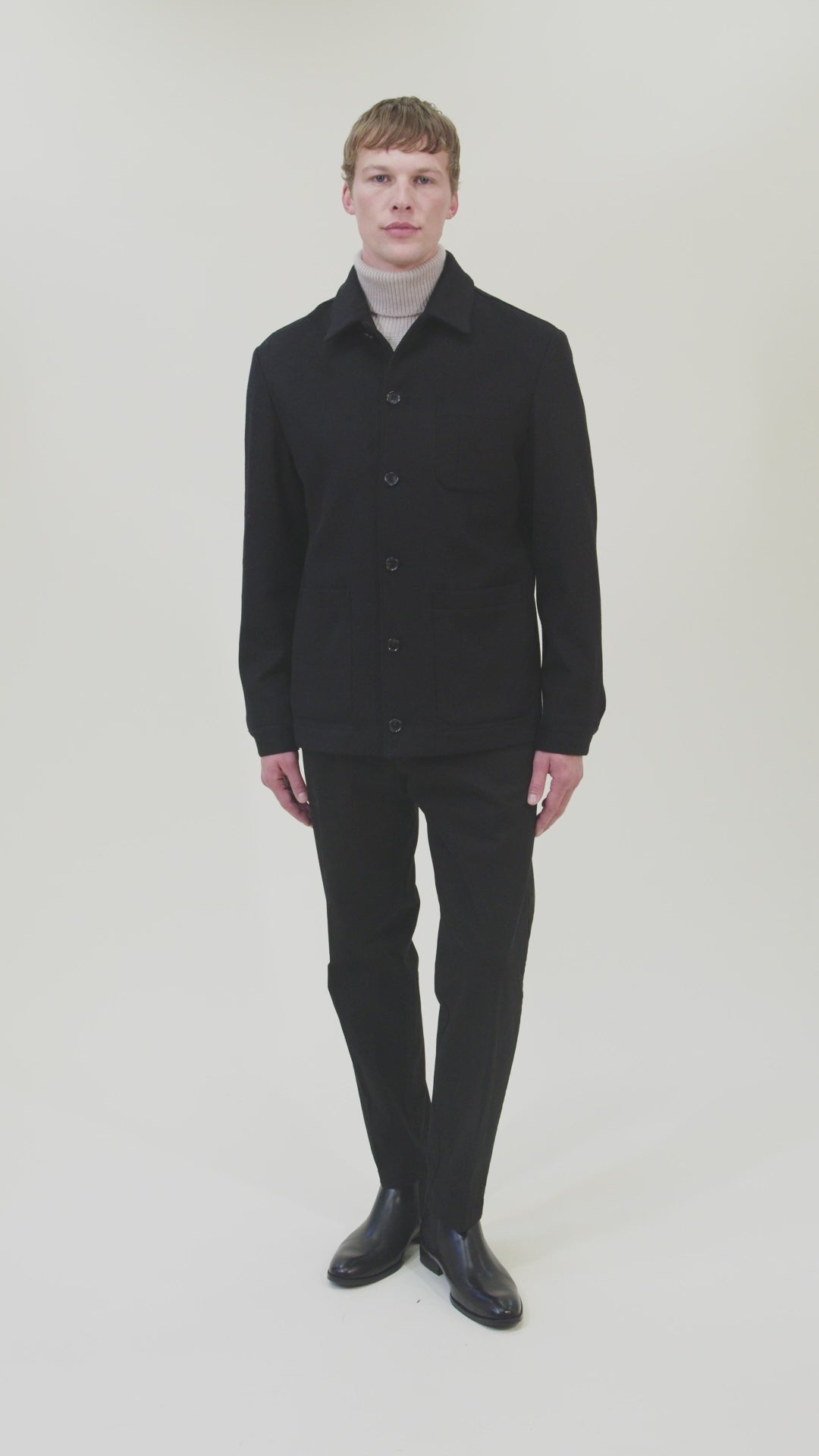 Elegant overshirt featuring a six-button closure, two side patch pockets, and a refined front pocket. Our model, 185 cm tall, wears a size 50 with measurements: chest 95 cm, waist 82 cm, hips 92 cm.