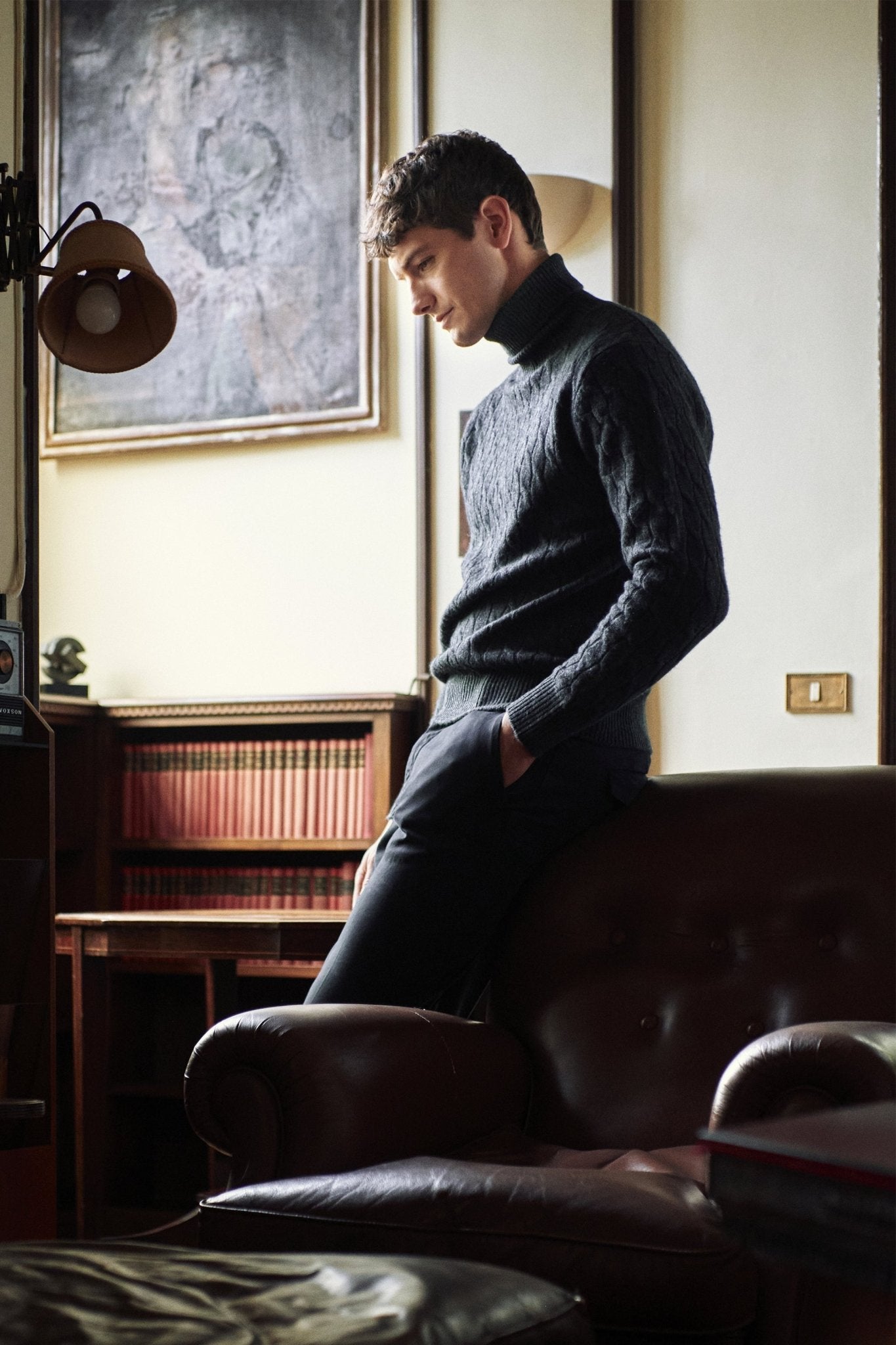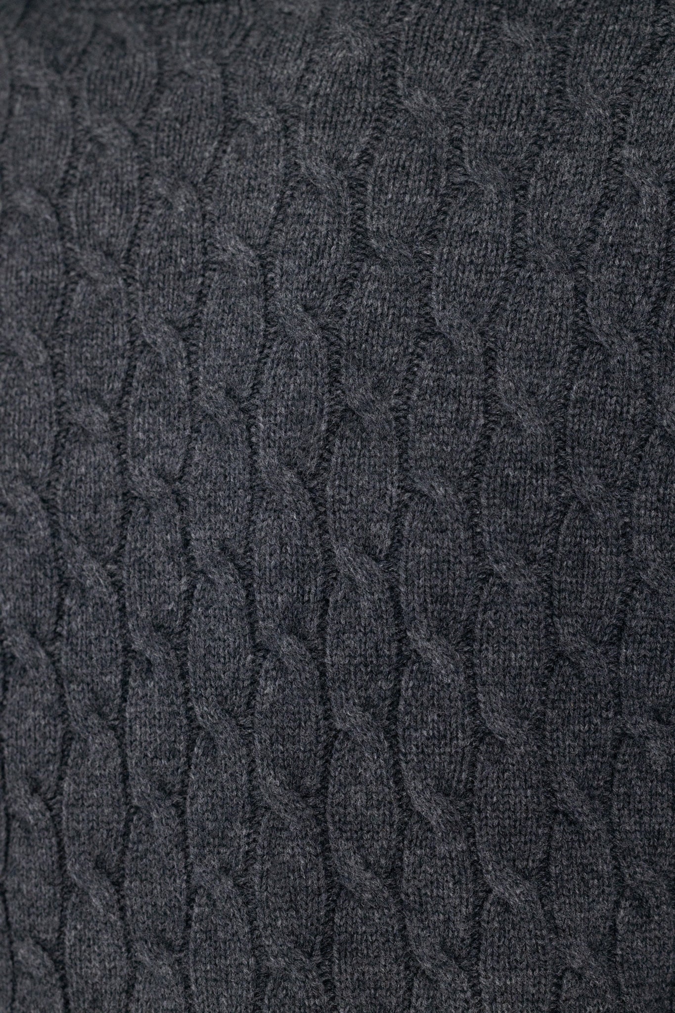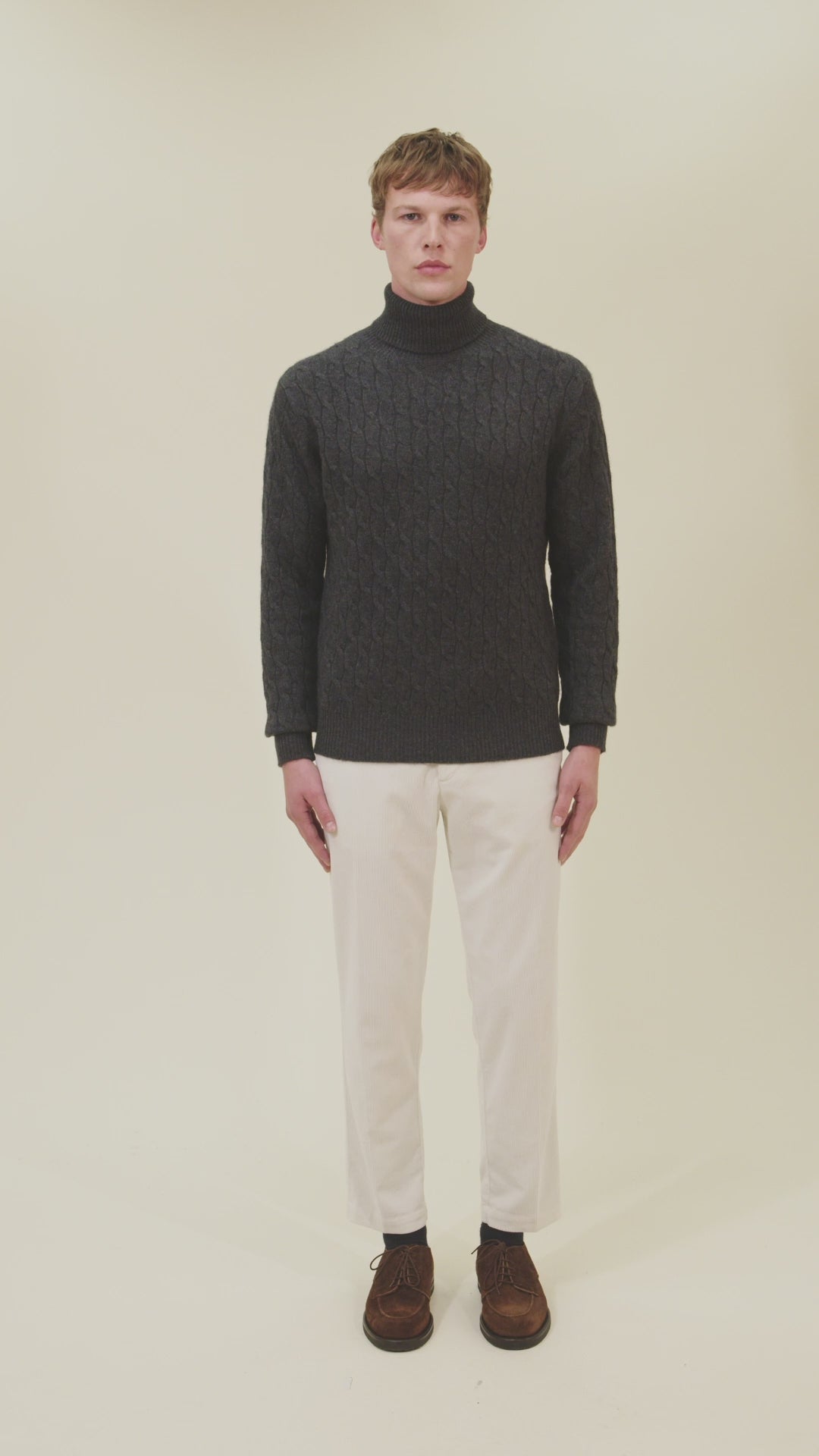 Turtleneck sweater with cable knit. Gauge 7 - 2 ply. The model is 185 cm tall and wears a size L.