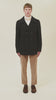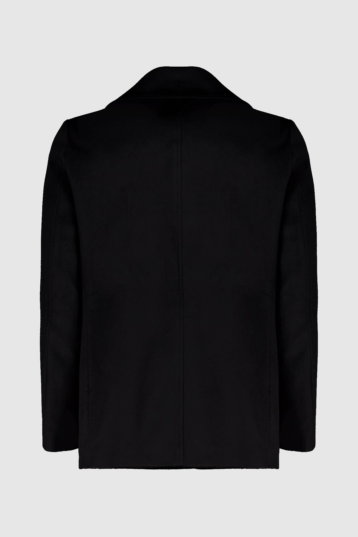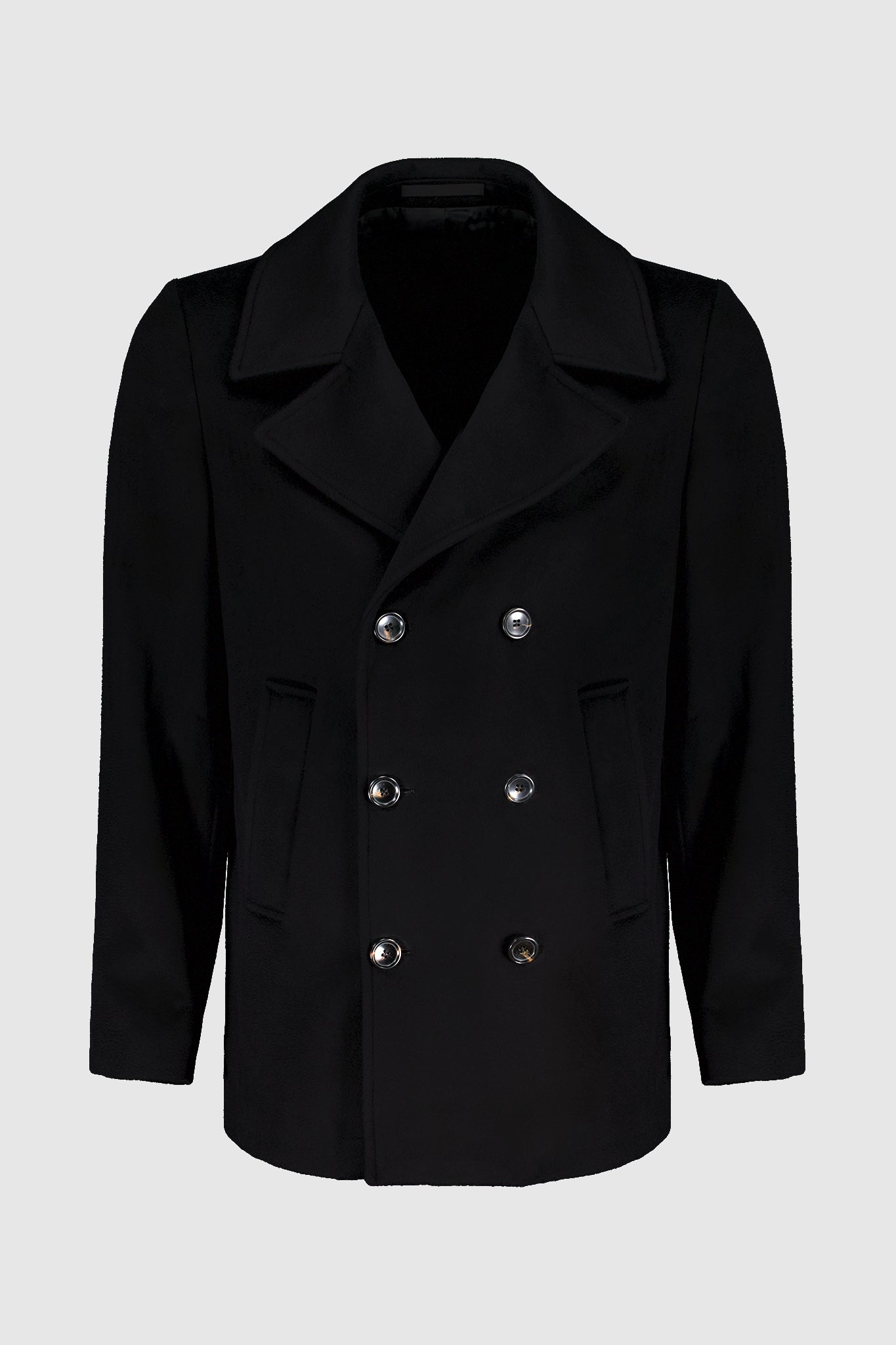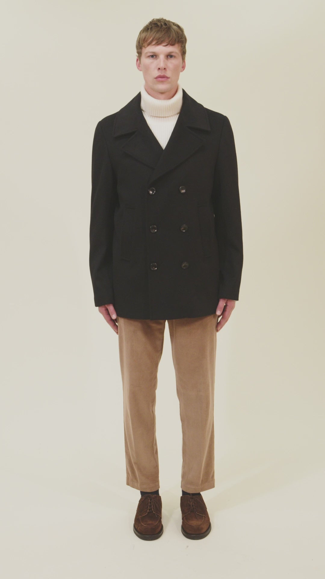 A refined pea coat in pure virgin wool, expertly crafted by Italian artisans. It features an elegant six-button closure and two practical side pockets.