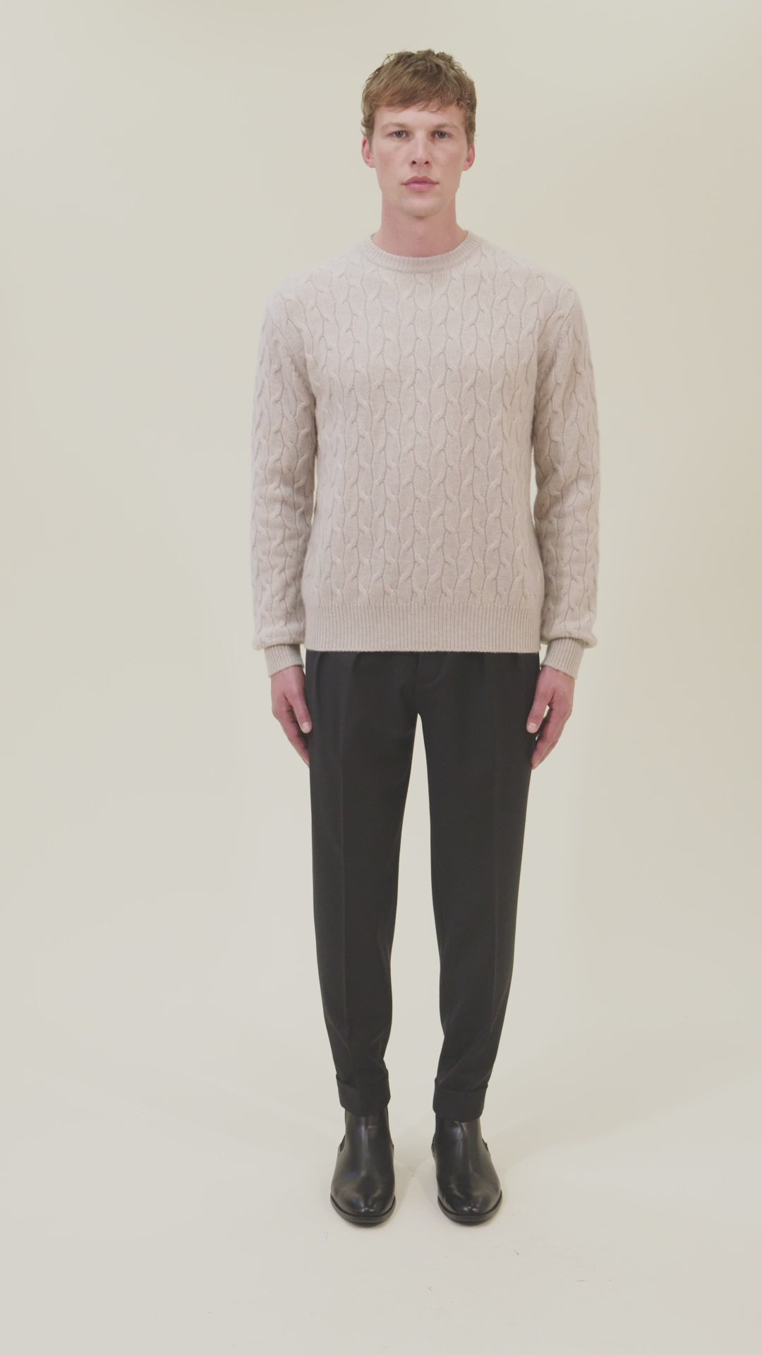 Crew neck sweater with cable knit. Gauge 7 - 2 ply.