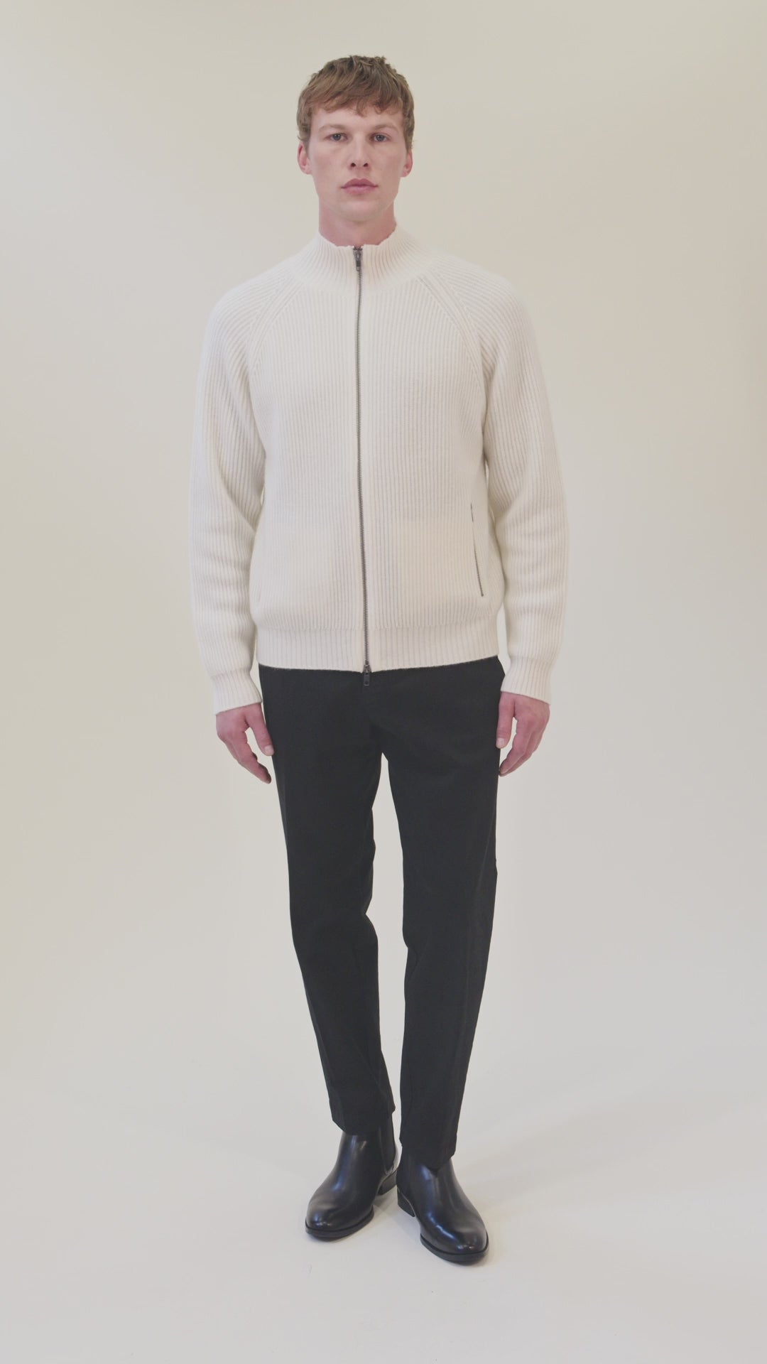A sophisticated full-zip cardigan crafted in English rib with raglan sleeves and side pockets. Knitted in a 7-gauge 2-ply wool and cashmere blend.
