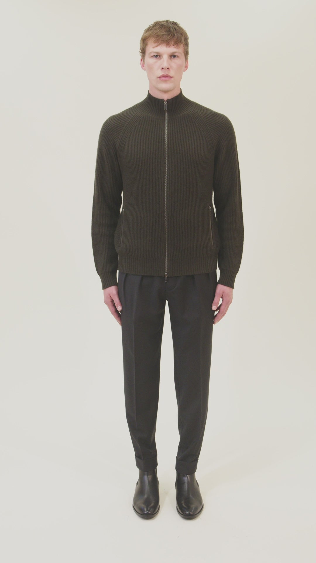 A sophisticated full-zip cardigan crafted in English rib with raglan sleeves and side pockets. Knitted from a 2-ply, 7-gauge wool and cashmere blend.