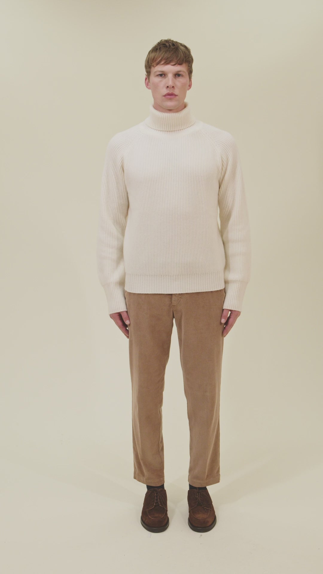 Elegant English rib turtleneck sweater crafted from premium wool and cashmere, featuring raglan sleeves and a double-thread 7 gauge knit. This piece is shown on a 185 cm tall model wearing size L, with chest 95 cm, waist 82 cm.