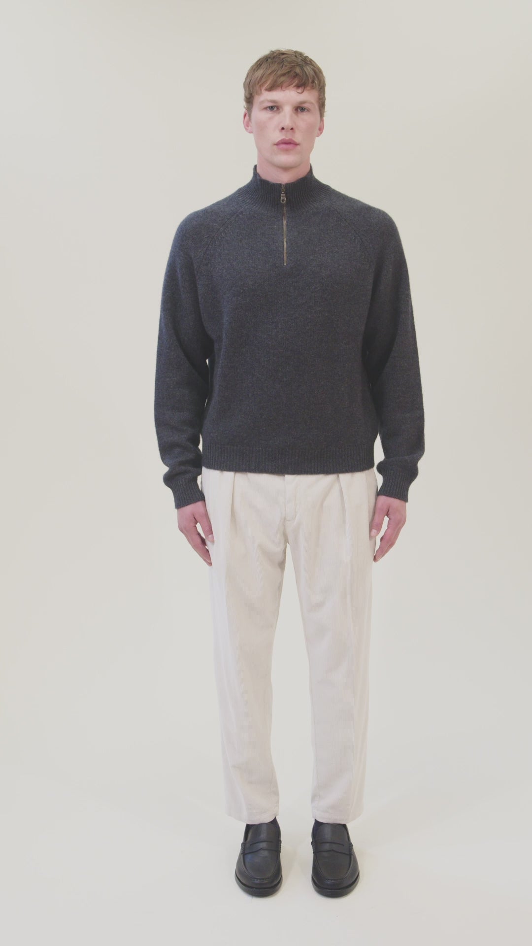 Elegantly crafted with a half-zip design, this raglan shoulder turtleneck sweater is knitted in a 5-gauge triple-thread wool and cashmere blend.