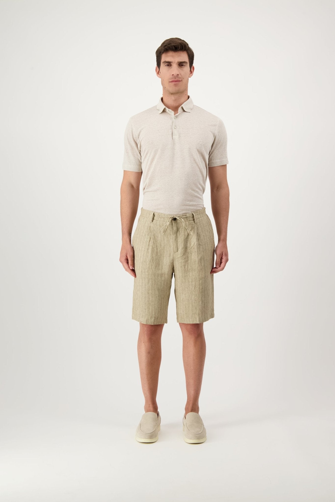 Linen shorts with slant pockets and zip closure. The model is 188 cm tall and wears a size 50.