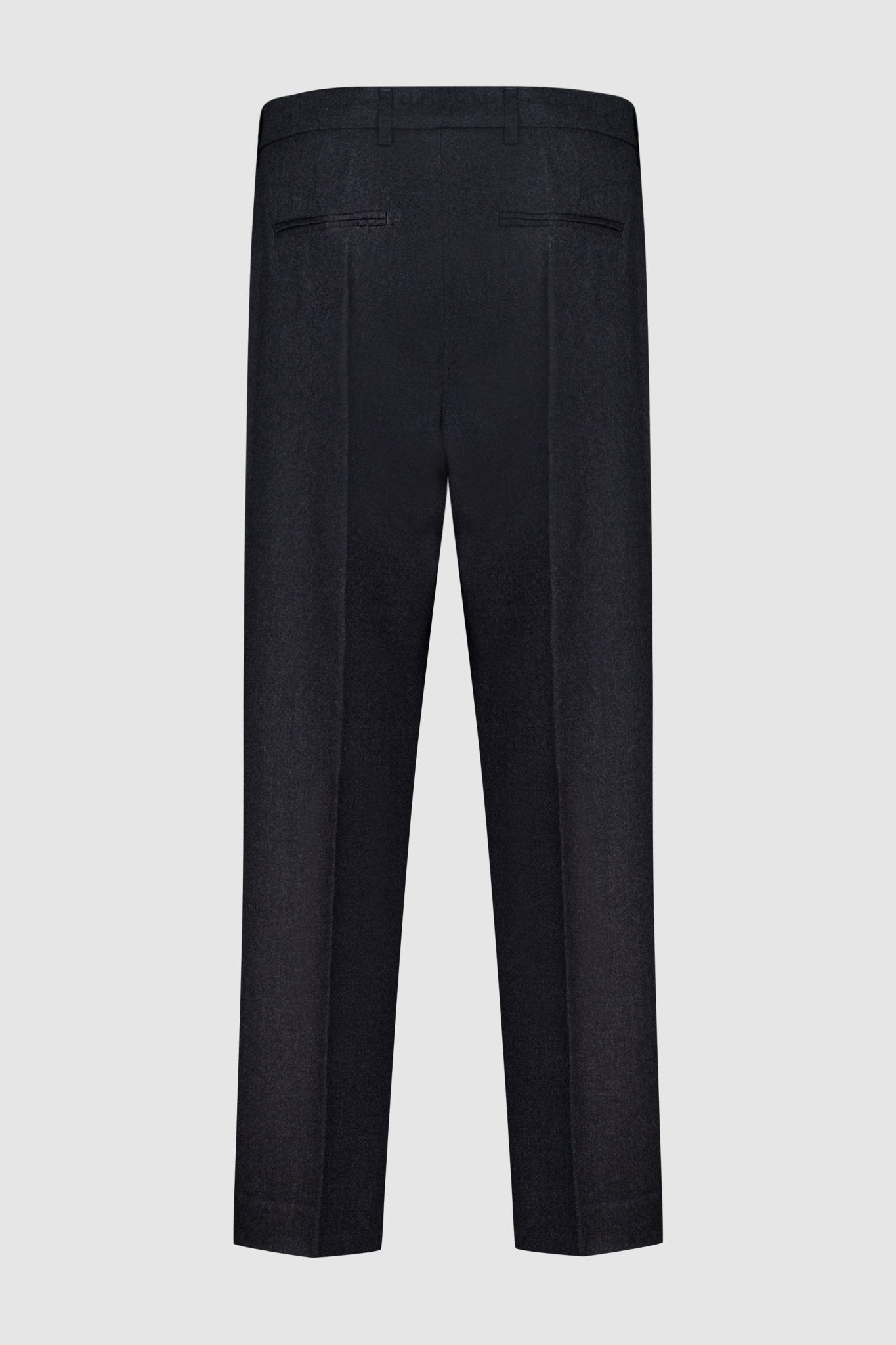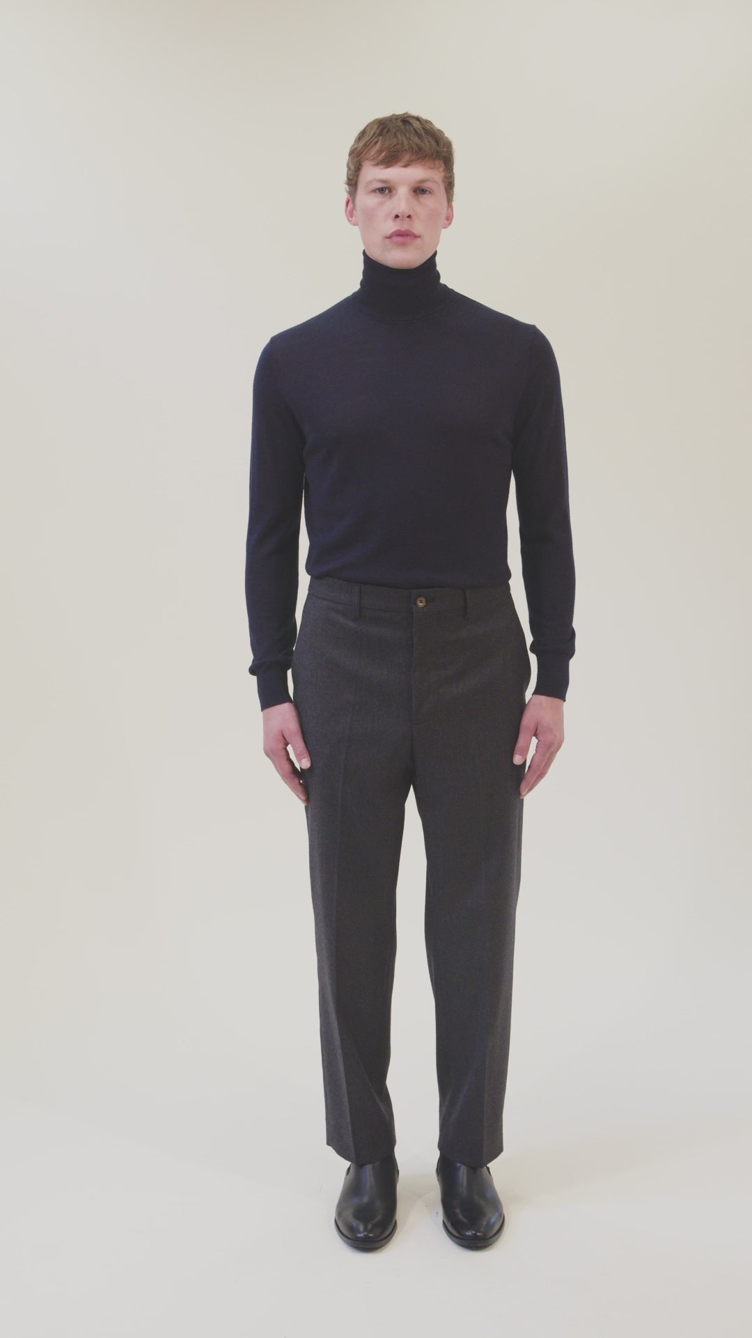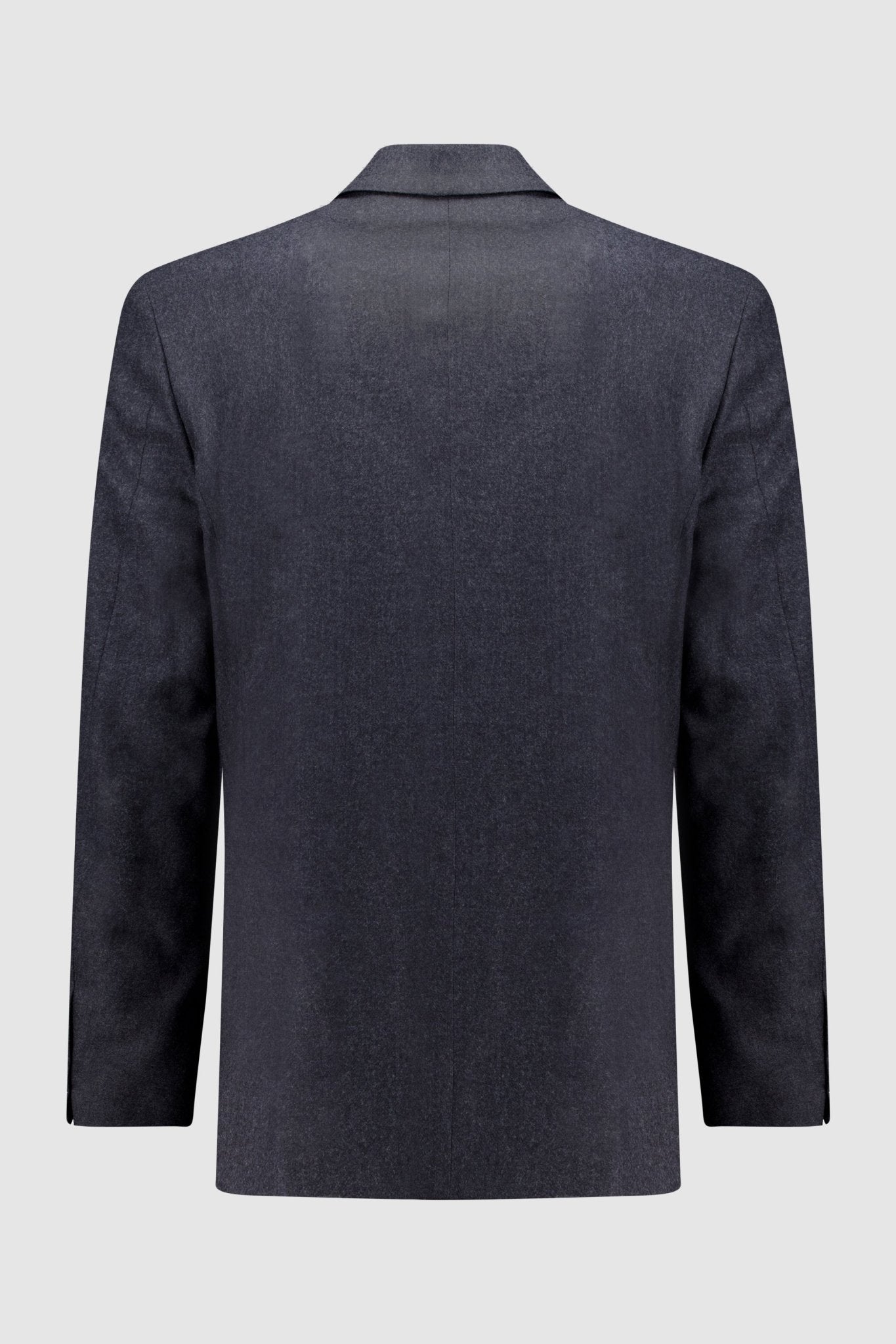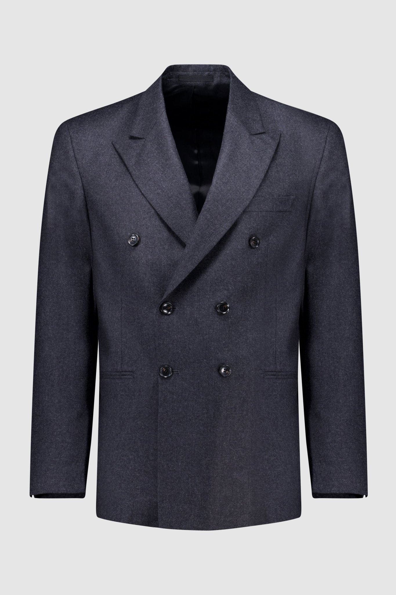 Elegant double-breasted jacket featuring refined peak lapels and welt pockets with a breast pocket. It features straight cuffs with three buttons. The garment, crafted from fine wool and cashmere, is worn by a 185 cm model in a size 50 with measurements: chest 95 cm, waist 82 cm, hips 92 cm.