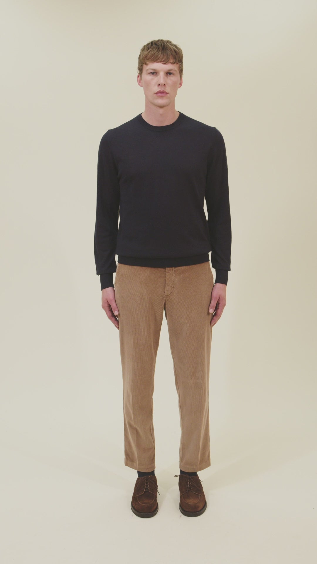 Refined crewneck sweater in premium Merino wool, knit with a 16 gauge plain weave. The elegant silhouette perfectly suits the male figure. Our model, 185 cm tall with a chest of 95 cm, waist of 82 cm, and hips of 92 cm, wears a size L for an impeccable fit.